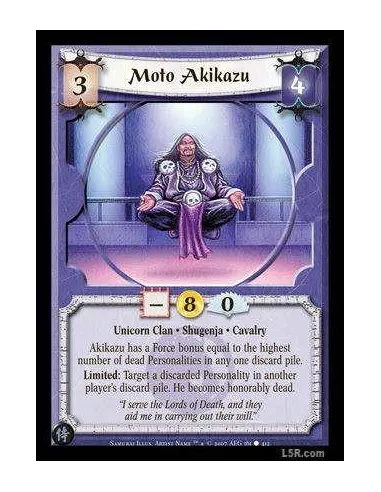 Unicorn Clan · Shugenja · Cavalry. Akikazu has a Force bonus equal to the highest number of dead Personalities in any one discard pile. Limited: Target a discarded Personality in another player's discard pile. He becomes Honorable Dead.