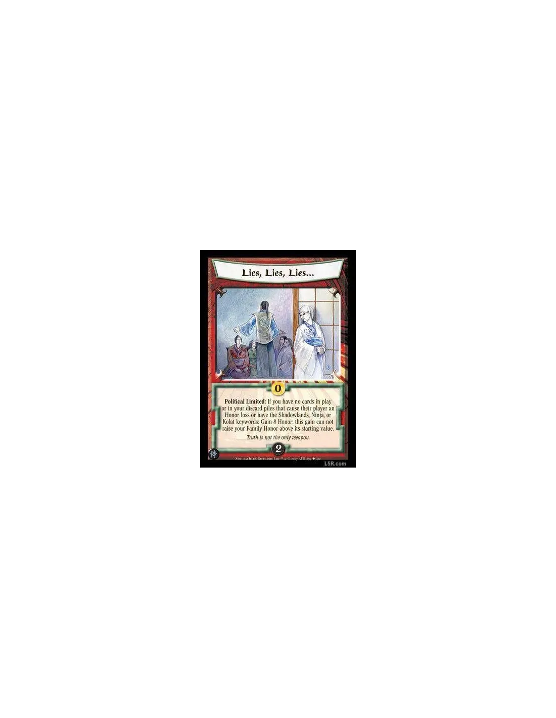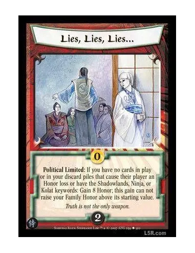 Political Limited : If you have no cards in play or in your discard piles that cause their player an Honor loss or have the Shadowlands, Ninja, or Kolat keywords: Gain 8 Honor; this gain can not raise your Family Honor above its starting value.