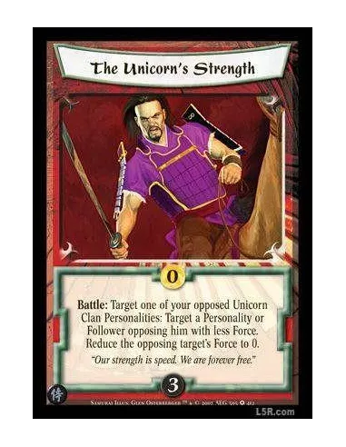 Battle: Target one of your opposed Unicorn Clan Personalities: Target a Personality or Follower opposing him with less Force. Reduce the opposing target's Force to 0.