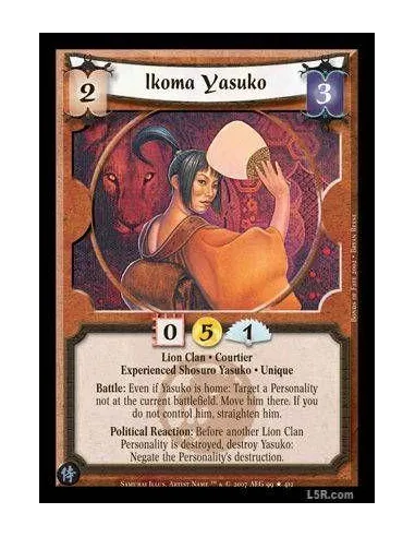 Lion Clan · Courtier · Experienced Shosuro Yasuko · Unique. Battle: Even if Yasuko is home: Target a Personality not at the current battlefield. Move him there. If you do not control him, straighten him. Political Reaction: Before another Lion Clan Personality is destroyed, destroy Yasuko: Negate the Personality's destruction