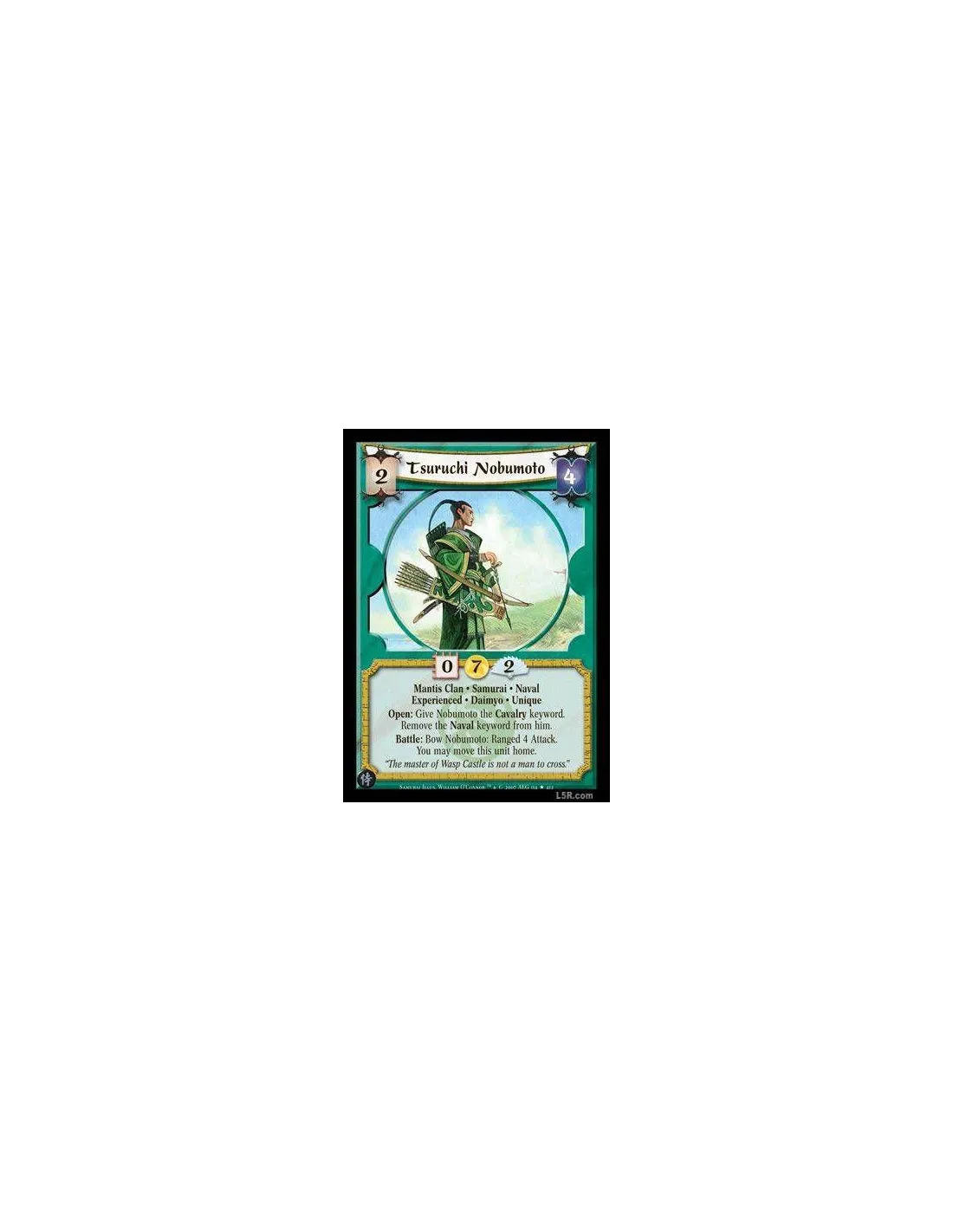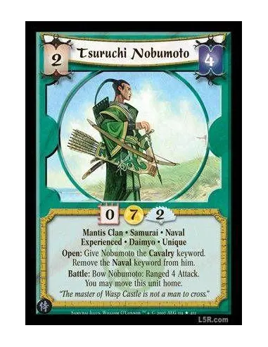 Mantis Clan · Samurai · Naval · Experienced · Daimyo · Unique. Open: Give Nobumoto the Cavalry keyword. Remove the Naval keyword from him. Battle: Bow Nobumoto: Ranged 4 Attack. You may move this unit home