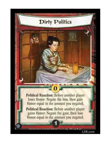 Political Reaction : Before another player loses Honor: Negate the loss, then gain Honor equal to the amount you negated.Political Reaction : Before another player gains Honor: Negate the gain, then lose Honor equal to the amount you negated.
