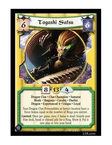 Dragon Clan · Clan Champion · Samurai · Monk · Shugenja · Cavalry · Duelist · Dragon · Experienced 4 · Unique · Loyal your Dragon Clan Personalities at Satsu's location have a Force bonus equal to the number of Rings you control.Limited: Once per Game, even if Satsu is dead: Search your Fate deck, hand or discard pile for a Ring. Sow it. Put it into play otr into your hand.