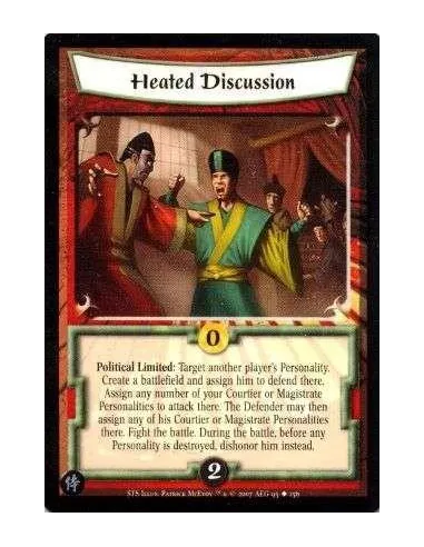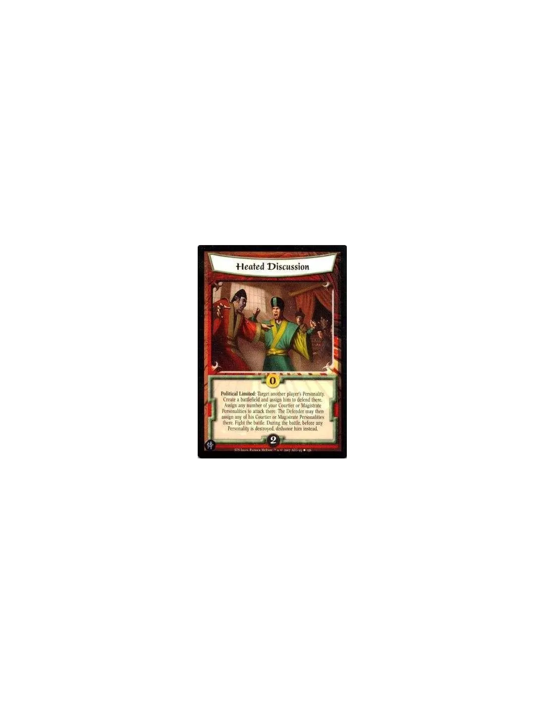 Political Limited: Target another's player Personality. Create a battlefield and assing him to defend there. Assing any number of your Courtier or Magistrates Personalities to attack there. The Defender may assign any of his Courties or Magistrate Persona