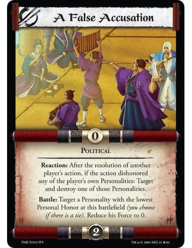 Political Reaction: After the resolution of another player's action, if the action dishonored any of the player's own Personalities: Target and destroy one of those Personalities. Battle: Target a Personality with the lowest Personal Honor at this battlefield (you choose if there is a tie). Reduce his Force to 0.