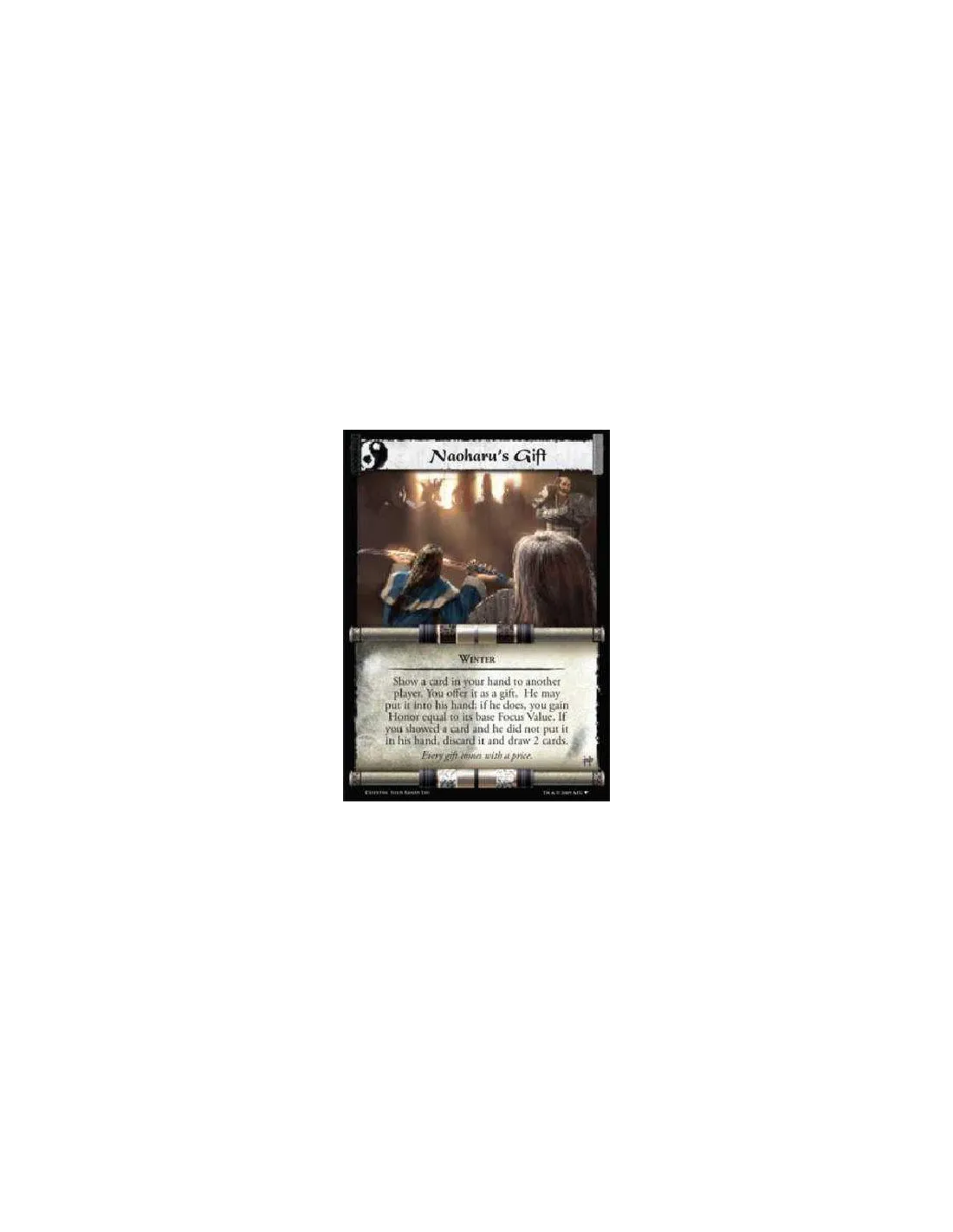Show a card in your hand to another player. You offer it as a gift. He may put it into his hand; if he does, you gain Honor equal to its base Focus Value. If you showed a card and he did not put it in his hand, discard it and draw 2 cards.