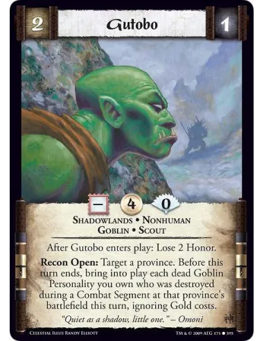Shadowlands • Nonhuman • Goblin • Scout After Gutobo enters play: Lose 2 Honor. Recon Open: Target a province. Before this turn ends, bring into play each dead Goblin Personality you own who was destroyed during a Combat Segment at that province's battlefield this turn, ignoring Gold costs.