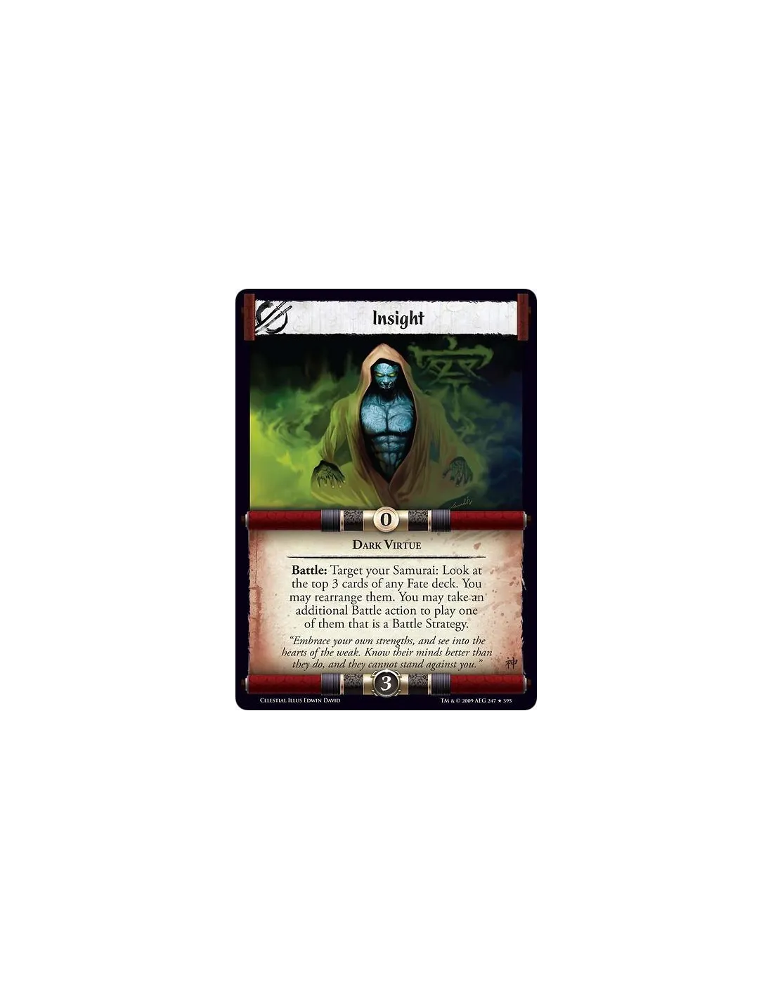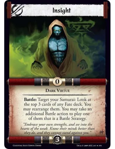 Dark Virtue Battle: Target your Samurai: Look at the top 3 cards of any Fate deck. You may rearrange them. You may take an additional Battle action to play one of them that is a Battle Strategy.