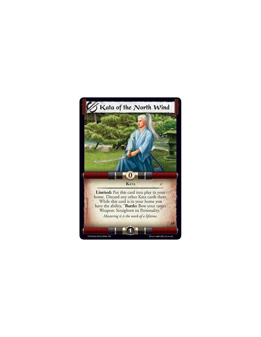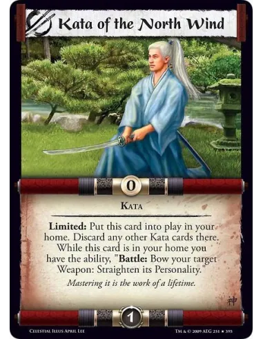 Kata Limited: Put this card into play in your home. Discard any other Kata cards there. While this card is in your home you have the ability, "Battle: Bow your target Weapon: Straighten its Personality."