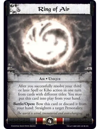 Air • Unique After you successfully resolve your third or later Spell or Kiho action in one turn from cards with different titles: You may put this card into play from your hand. Battle/Open: Bow this card or discard it from your hand: Straighten a target Personality.