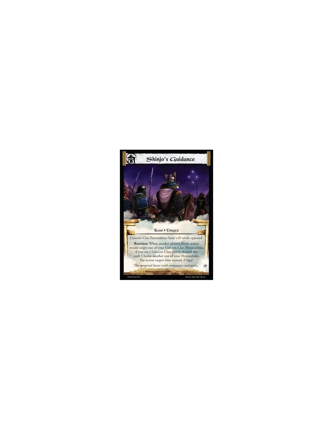 Kami • Unique Unicorn Clan Personalities have +1F while opposed. Reaction: When another player’s Battle action would target one of your Unicorn Clan Personalities, if you are a Unicorn Clan player, discard this card: Choose another one of your Personalities. The action targets him instead, if legal.