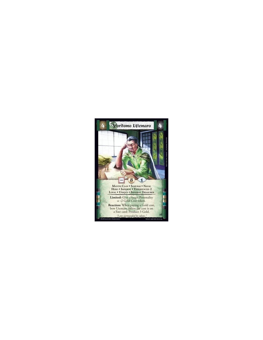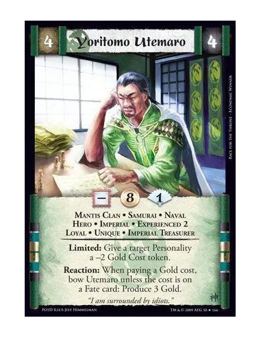Mantis Clan • Samurai • Naval • Hero • Imperial • Experienced 2 • Loyal • Unique • Imperial Treasurer Limited: Give a target Personality a -2 Gold Cost token. Reaction: When paying a Gold cost, bow Utemaro unless the cost is on a Fate card: Produce 3 Gold.