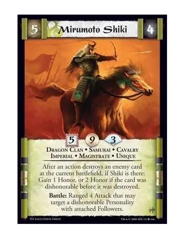 Dragon Clan • Samurai • Cavalry • Imperial • Magistrate • Unique After an action destroys an enemy card at the current battlefield, if Shiki is there: Gain 1 Honor, or 2 Honor if the card was dishonorable before it was destroyed. Battle: Ranged 4 Attack that may target a dishonorable Personality with attached Followers.