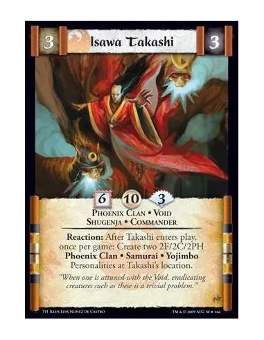 Phoenix Clan • Void • Shugenja • Commander Reaction: After Takashi enters play, once per game: Create two 2F/2C/2PH Phoenix Clan • Samurai • Yojimbo Personalities at Takashi’s location.