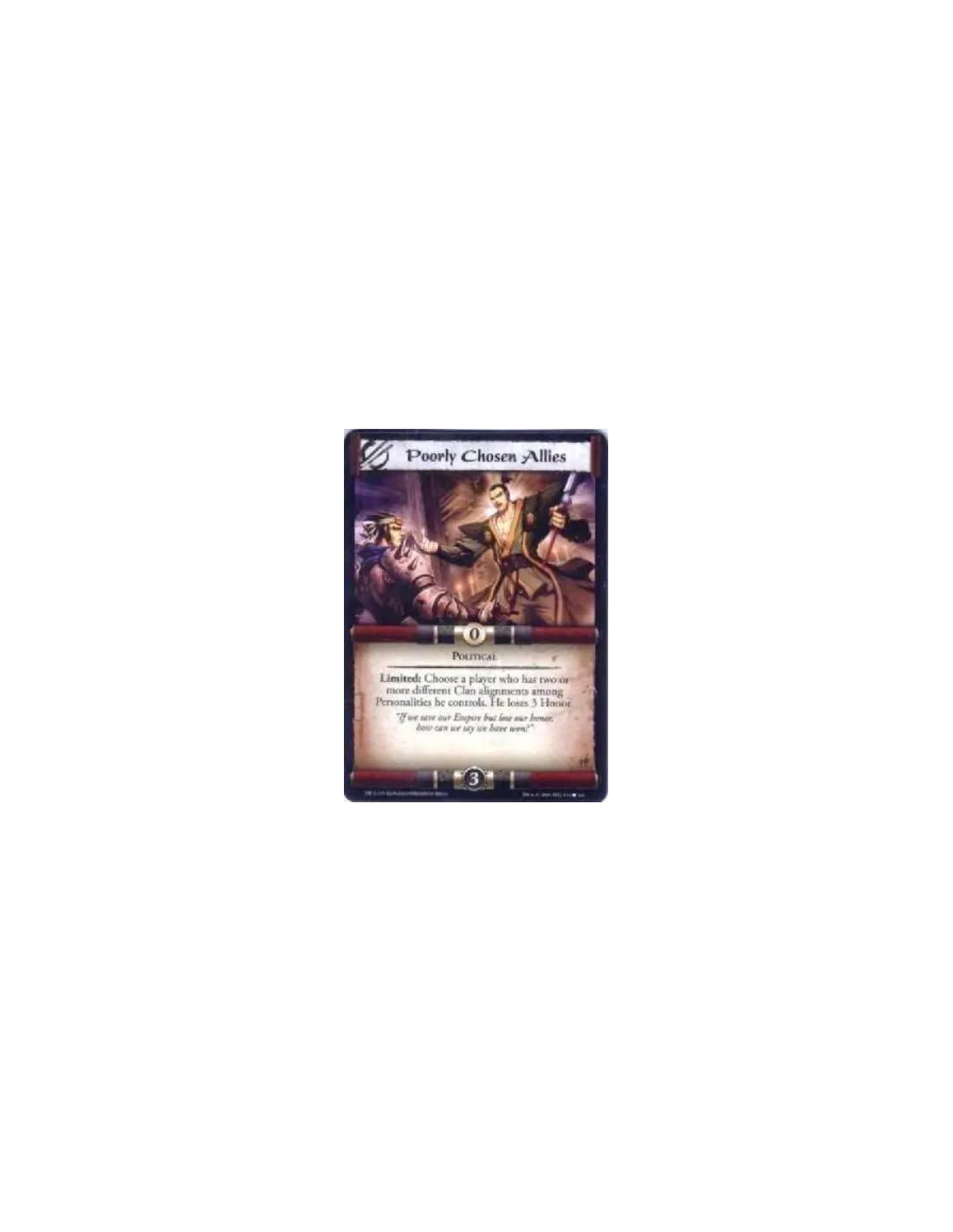Political Limited: Choose a player who has two or more different Clan alignments among Personalities he controls. He loses 3 Honor.