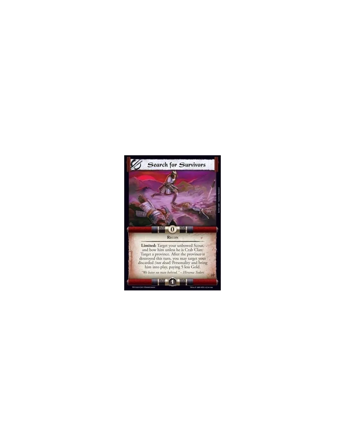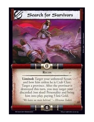 Recon Limited: Target your unbowed Scout, and bow him unless he is Crab Clan: Target a province. After the province is destroyed this turn, you may target your discarded (not dead) Personality and bring him into play, paying 5 less Gold.