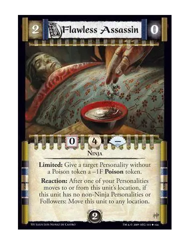 Ninja Limited: Give a target Personality without a Poison token a -1F Poison token. Reaction: After one of your Personalities moves to or from this unit’s location, if this unit has no non-Ninja Personalities or Followers: Move this unit to any location.