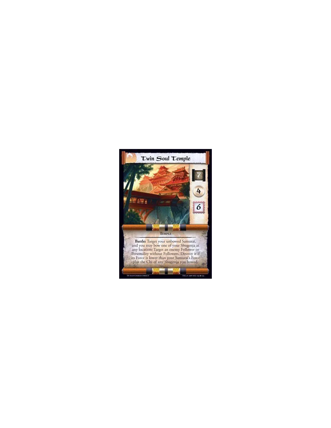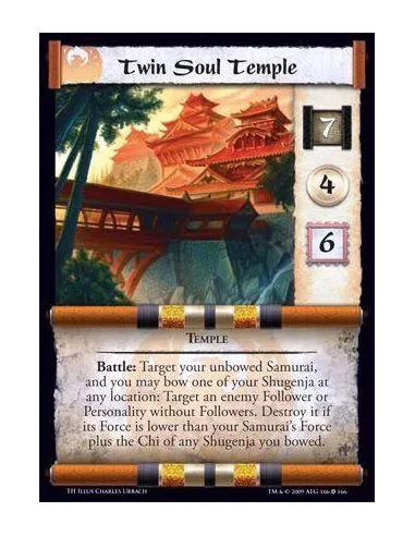 Temple Battle: Target your unbowed Samurai, and you may bow one of your Shugenja at any location: Target an enemy Follower or Personality without Followers. Destroy it if its Force is lower than your Samurai’s Force plus the Chi of any Shugenja you bowed.
