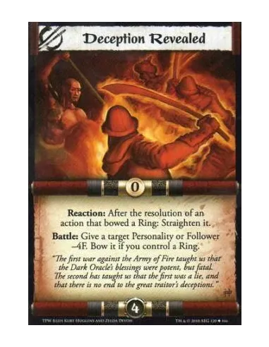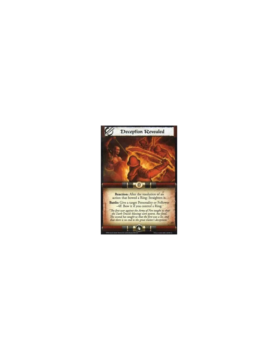 Reaction: After the resolution of an action that bowed a Ring: Straighten it. Battle: Give a target Personality or Follower -4F. Bow it if you control a Ring.