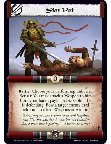 Battle: Choose your performing unbowed Kensai: You may attach a Weapon to him from your hand, paying 4 less Gold if he is defending. Bow a target enemy card without attached Weapons or Armor.