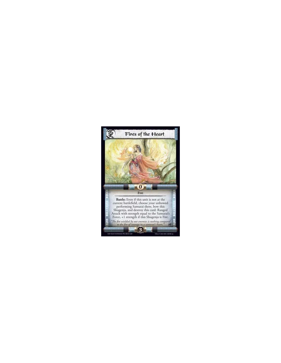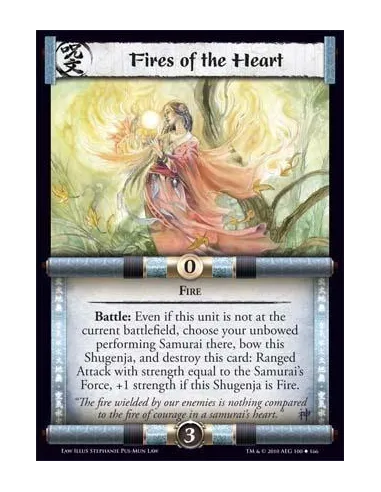 Fire Battle: Even if this unit is not at the current battlefield, choose your unbowed performing Samurai there, bow this Shugenja, and destroy this card: Ranged Attack with strength equal to the Samurai’s Force, +1 strength if this Shugenja is Fire.