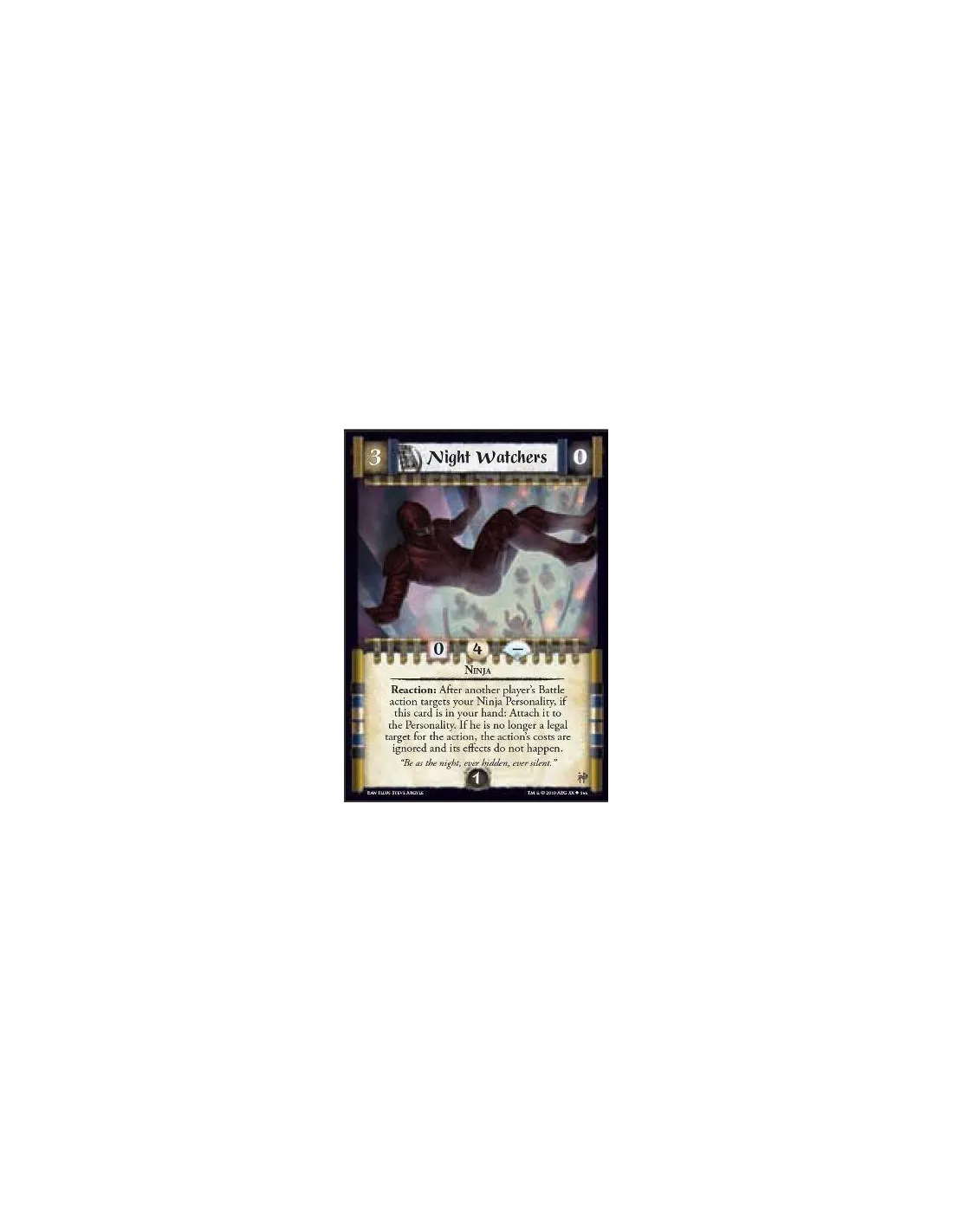 Ninja Reaction: After another player’s Battle action targets your Ninja Personality, if this card is in your hand: Attach it to the Personality. If he is no longer a legal target for the action, the action’s costs are ignored and its effects do not happen.