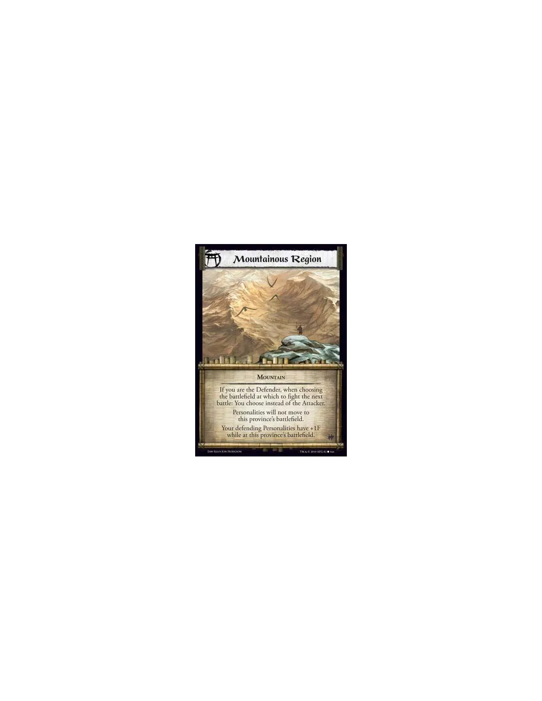 Mountain If you are the Defender, when choosing the battlefield at which to fight the next battle: You choose instead of the Attacker. Personalities will not move to this province’s battlefield. Your defending Personalities have +1F while at this province’s battlefield.