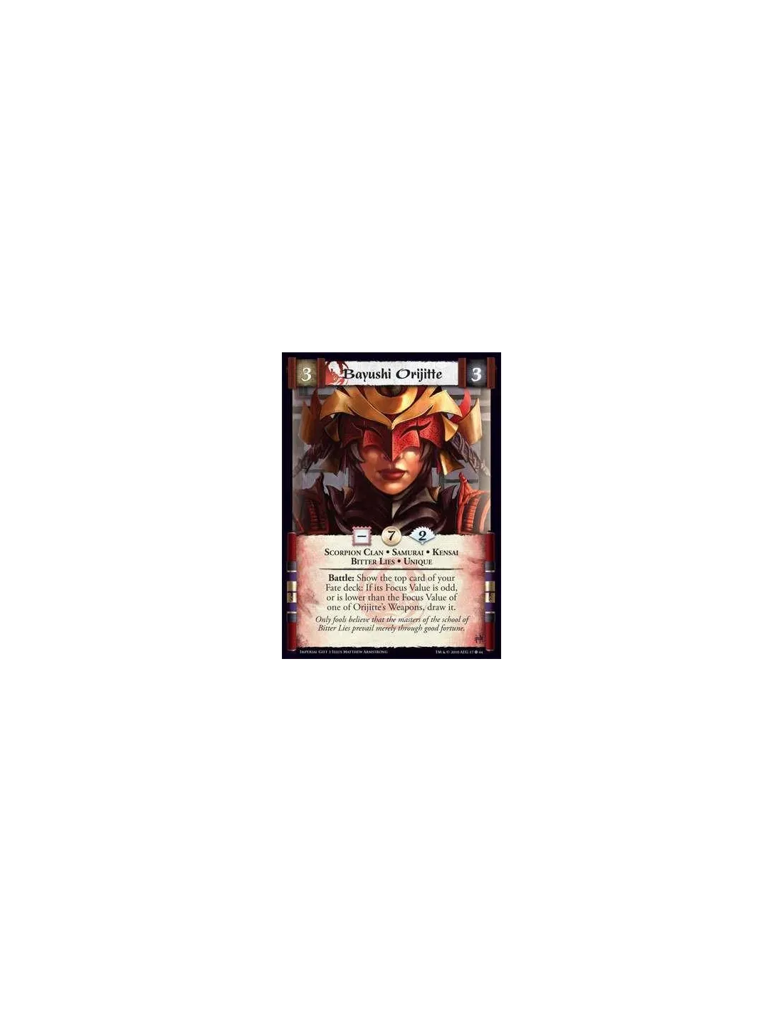 Scorpion Clan • Samurai • Kensai • Bitter Lies • Unique Battle: Show the top card of your Fate deck: If its Focus Value is odd, or is lower than the Focus Value of one of Orijitte’s Weapons, draw it.