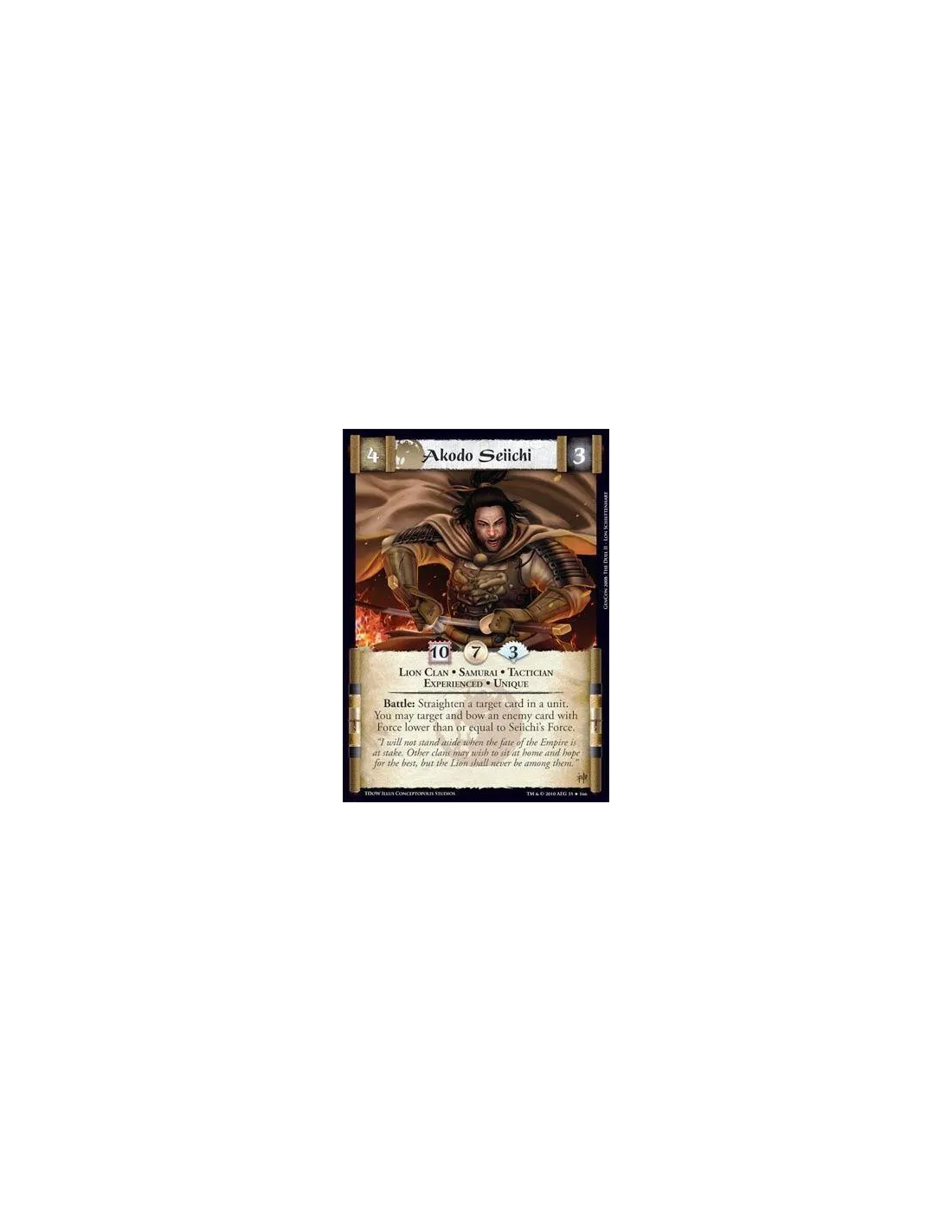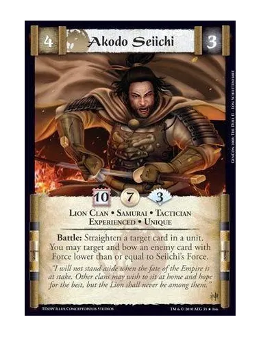 Lion Clan • Samurai • Tactician • Experienced • Unique Battle: Straighten a target card in a unit. You may target and bow an enemy card with Force lower than or equal to Seiichi’s Force.