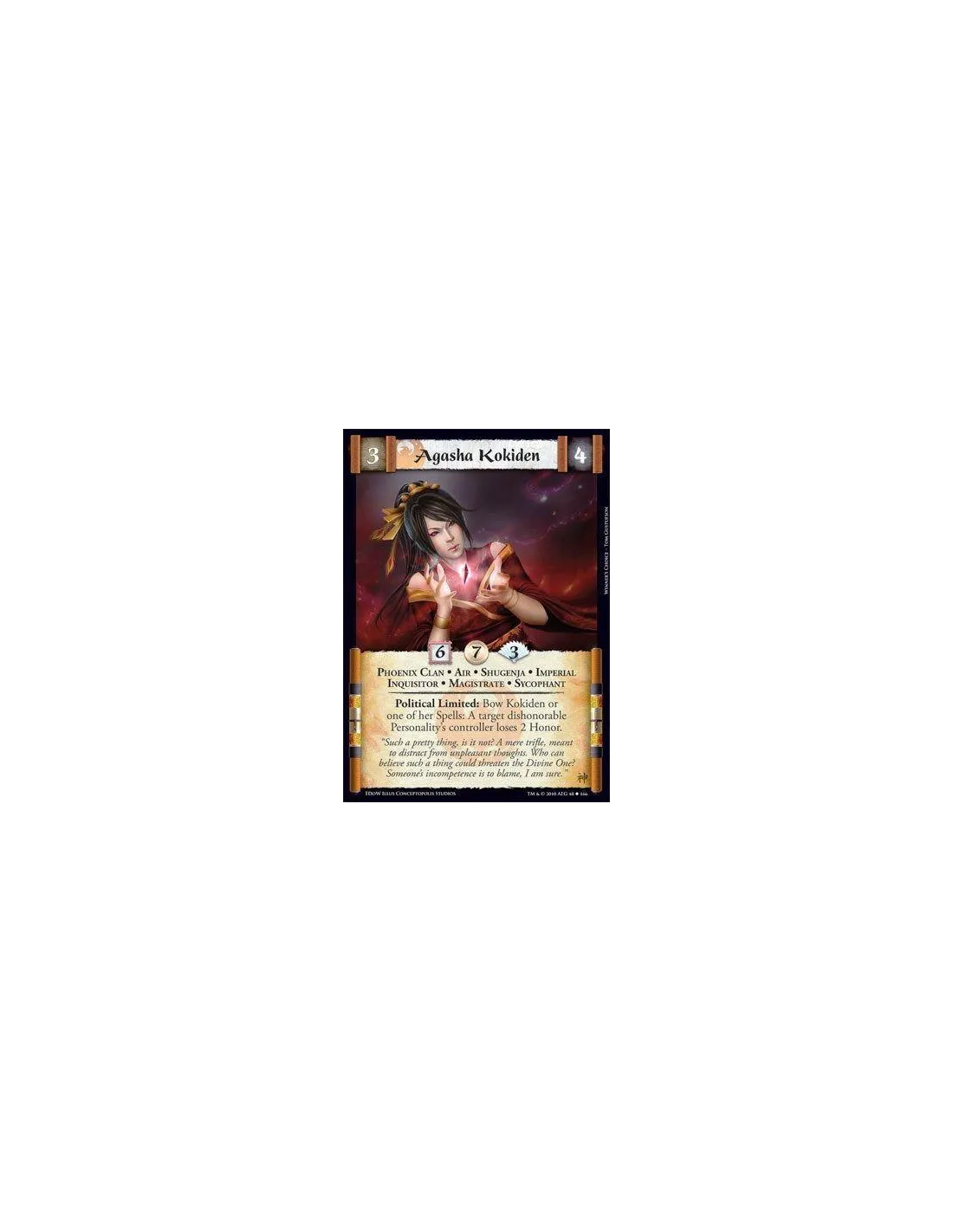 Phoenix Clan • Air • Shugenja • Imperial • Inquisitor • Magistrate • Sycophant Political Limited: Bow Kokiden or one of her Spells: A target dishonorable Personality’s controller loses 2 Honor.