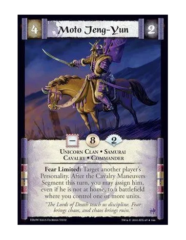 Unicorn Clan • Samurai • Cavalry • Commander Fear Limited: Target another player’s Personality. After the Cavalry Maneuvers Segment this turn, you may assign him, even if he is not at home, to a battlefield where you control one or more units.