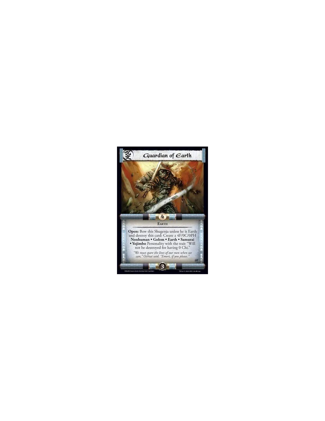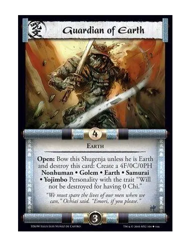 Earth Open: Bow this Shugenja unless he is Earth and destroy this card: Create a 4F/0C/0PH Nonhuman • Golem • Earth • Samurai • Yojimbo Personality with the trait “Will not be destroyed for having 0 Chi.”