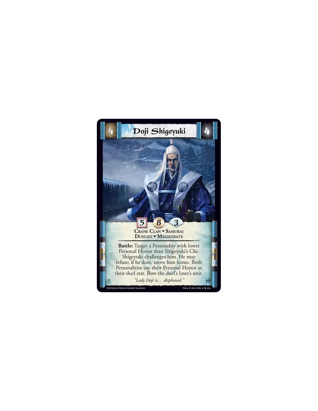 Battle: Target a Personality with lower Personal Honor than Shigeyuki’s Chi: Shigeyuki challenges him. He may refuse; if he does, move him home. Both Personalities use their Personal Honor as their duel stat. Bow the duel’s loser’s unit.