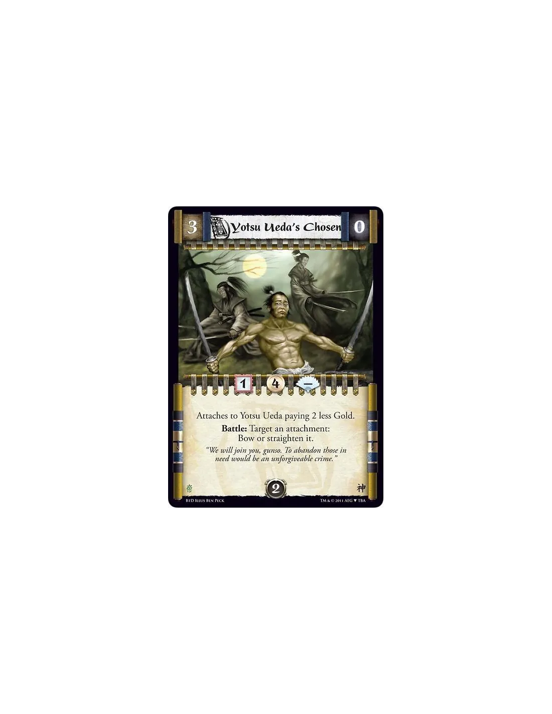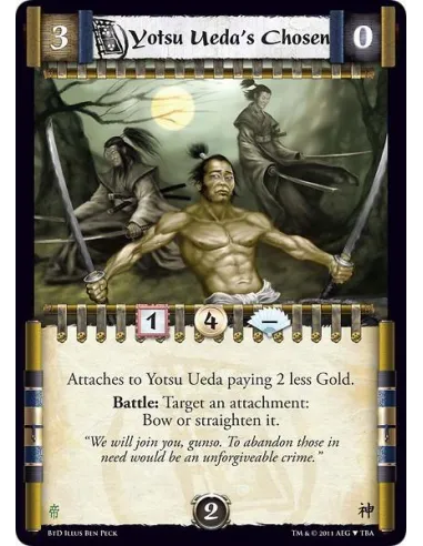 Attaches to Yotsu Ueda paying 2 less Gold. Battle: Target an attachment: Bow or straighten it.
