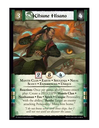 Reaction: Once per game after Hisano enters play: Create a 2F/2C/3PH Mantis Clan • Nohuman • Fox • Spirit • Unique Personality with the ability: "Battle: target an enemy attacking Personality: Move him home"