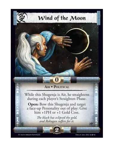 While this Shugenja is Air, he straightens during each player's Straighten Phase. Open: Bow this Shugenja and target a face-up Personality out of play: Give him +1PH or +1 Gold Cost.