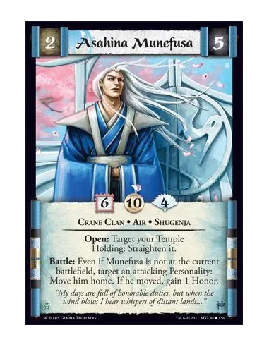 Open: Target your Temple Holding: Straighten it. Battle: Even if Munefusa is not at the current battlefield, target an attacking Personality: Move him home. If he moved, gain 1 Honor.