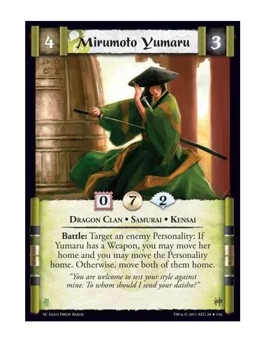 Battle: Target an enemy Personality: If Yumaru has a Weapon, you may move her home and you may move the Personality home. Otherwise, move both of them home.