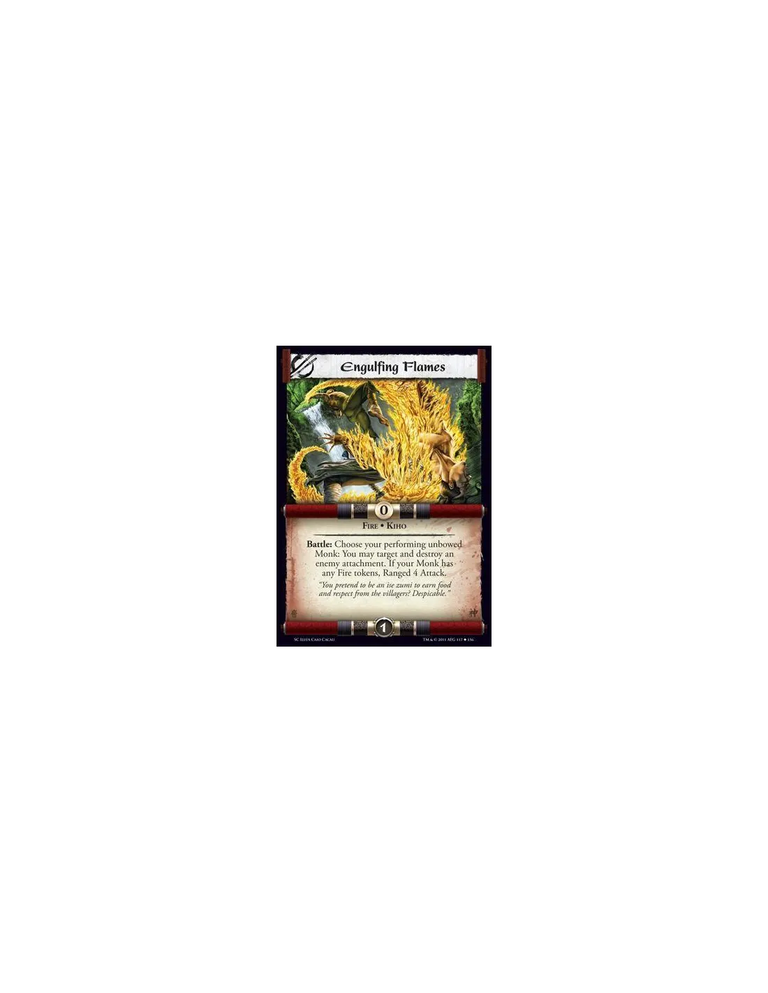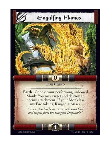 Battle: Choose your performing unbowed Monk: You may target and destroy an enemy attachment. If your Monk has any Fire tokens, Ranged 4 Attack.