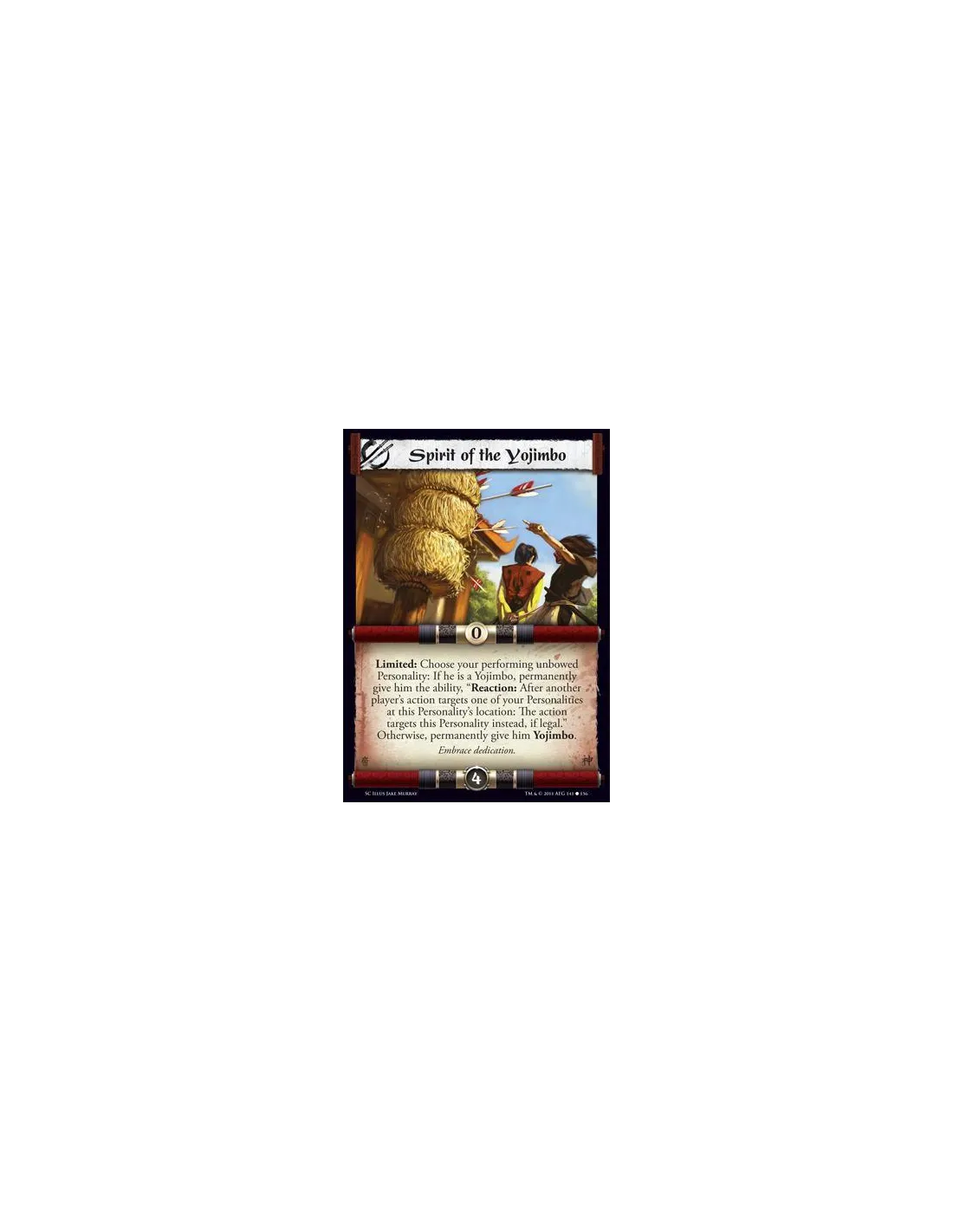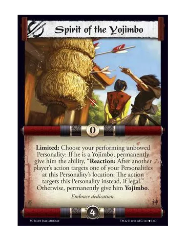 Limited: Choose your performing unbowed Personality: If he is a Yojimbo, permanently give him the ability, “Reaction: After another player’s action targets one of your Personalities at this Personality’s location: The action targets this Personality instead, if legal.” Otherwise, permanently give him Yojimbo.