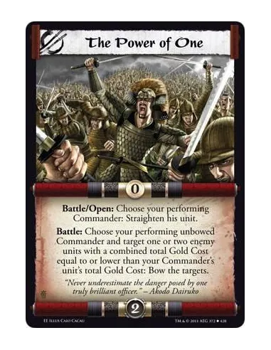 Battle/Open: Choose your performing Commander: Straighten his unit. Battle: Choose your performing unbowed Commander and target one or two enemy units with a combined total Gold Cost equal to or lower than your Commander’s unit’s total Gold Cost: Bow the targets.
