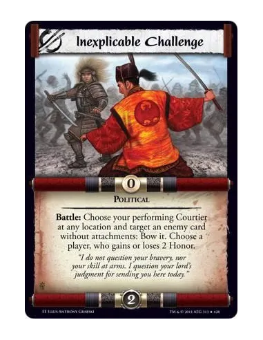 Battle: Choose your performing Courtier at any location and target an enemy card without attachments: Bow it. Choose a player, who gains or loses 2 Honor.