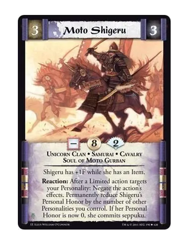 Shigeru has +1F while she has an Item. Reaction: After a Limited action targets your Personality: Negate the action’s effects. Permanently reduce Shigeru’s Personal Honor by the number of other Personalities you control. If her Personal Honor is now 0, she commits seppuku.