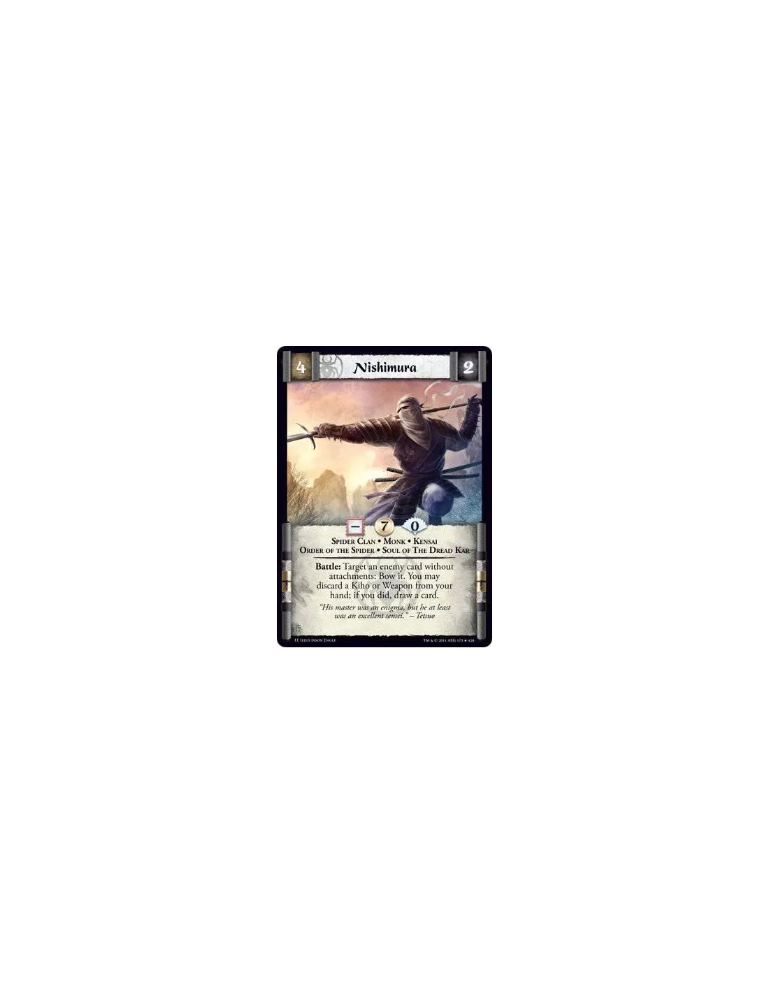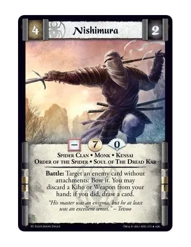 Battle: Target an enemy card without attachments: Bow it. You may discard a Kiho or Weapon from your hand; if you did, draw a card.