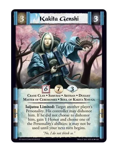 Iaijutsu Limited: Target another player’s Personality. His controller may dishonor him. If he did not choose to dishonor him, gain 1 Honor and choose one of the Personality’s abilities; it may not be used until your next turn begins.