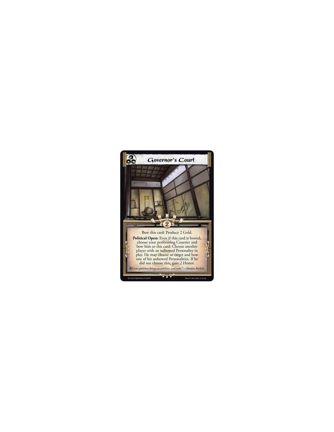Bow this card: Produce 2 Gold. Political Open: Even if this card is bowed, choose your performing Courtier and bow him or this card: Choose another player with an unbowed Personality in play. He may choose to target and bow one of his unbowed Personalities. If he did not choose this, gain 2 Honor.