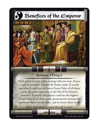 Each player in turn order starting with you may choose a card in his hand. Discard all chosen cards. If exactly one player’s card has the lowest Focus Value of all those cards, he gains a province to the left of his leftmost province. If exactly one player’s card has the highest Focus Value of all those cards, permanently increase his maximum hand size by three, and he draws three cards.