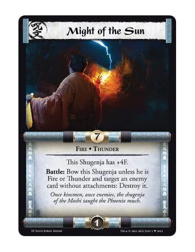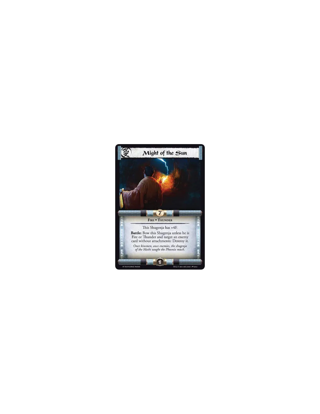 This Shugenja has +4F. Battle: Bow this Shugenja unless he is Fire or Thunder and target an enemy card without attachments: Destroy it.