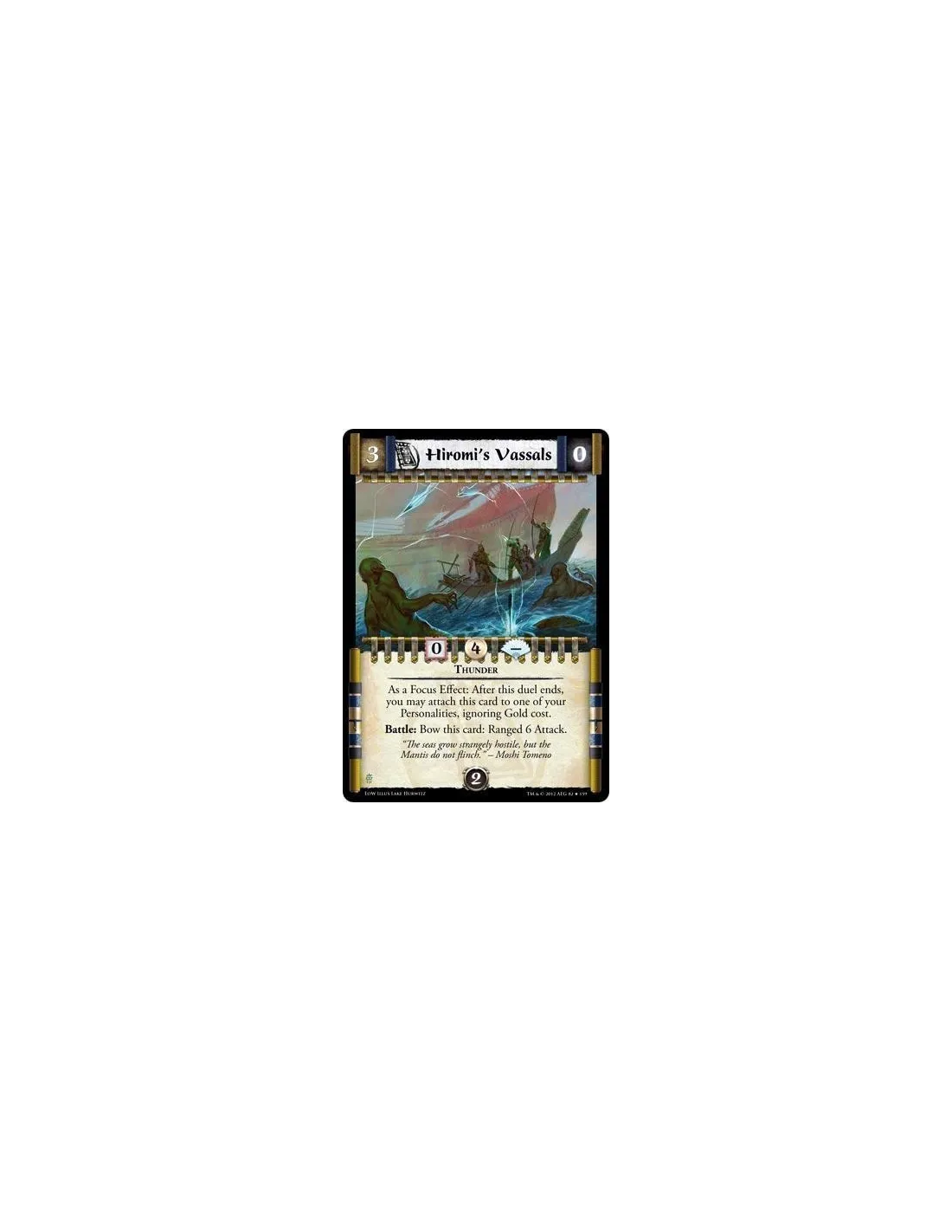 As a Focus Effect: After this duel ends, you may attach this follower to one of your Personalities, ignoring Gold Cost. Battle: Bow this card: Ranged 6 Attack