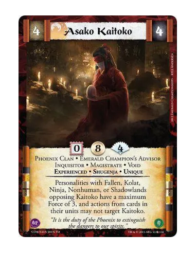 Personalities with Fallen, Kolat, Ninja, Nonhuman, or Shadowlands opposing Kaitoko have a maximum Force of 3, and actions from cards in their units may not target Kaitoko.